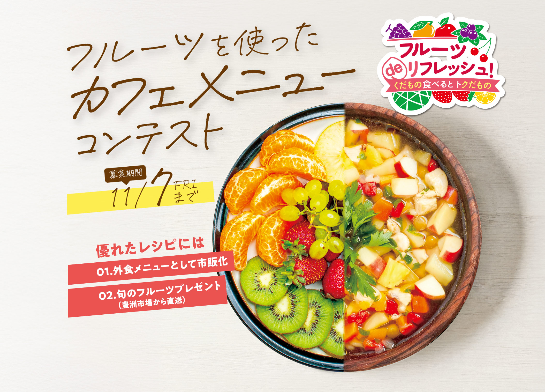 - 審査を通過した応募内容のうち、特に優れたレシピは外食企業により外食メニューとして市販化します。また、市販化が決定したレシピの応募者には、旬のフルーツを贈呈します(豊洲市場から直送)。